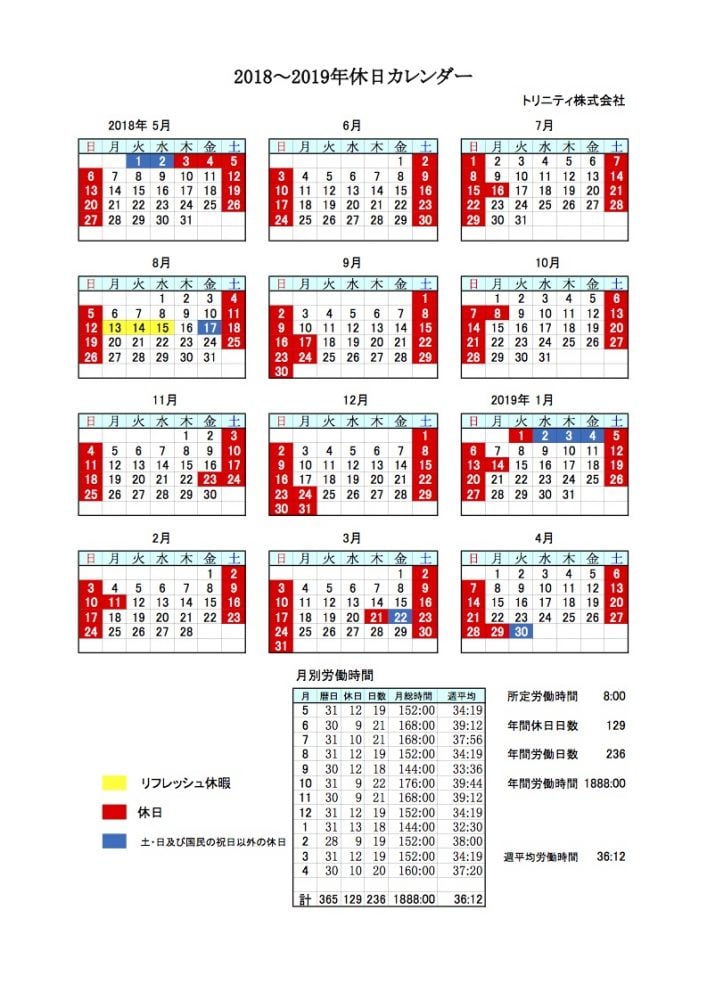 こちらが社内で告知された2018年5月から2019年4月までの一期(トリニティは5月1日から期がスタートします)の休日カレンダーです。中身を見ていただくとすべて分かりますが、年末年始とゴールデンウィークは大型連休にするために青い色が付いています。