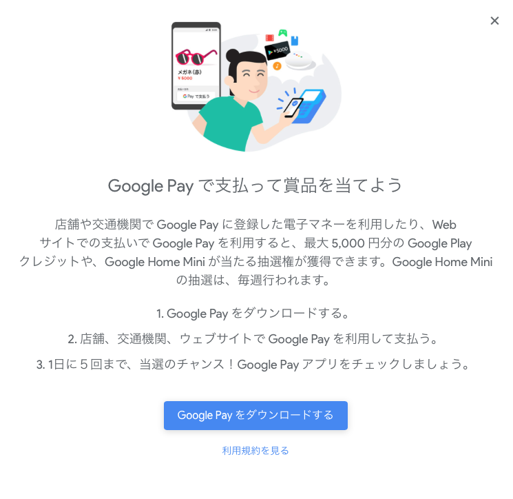上記画像のとおり、このキャンペーンは、Google Payに登録した電子マネーで支払いをすると、最大5000円分のGoogle Playクレジットや、Google Home Miniが当たる抽選券が獲得できるものです。