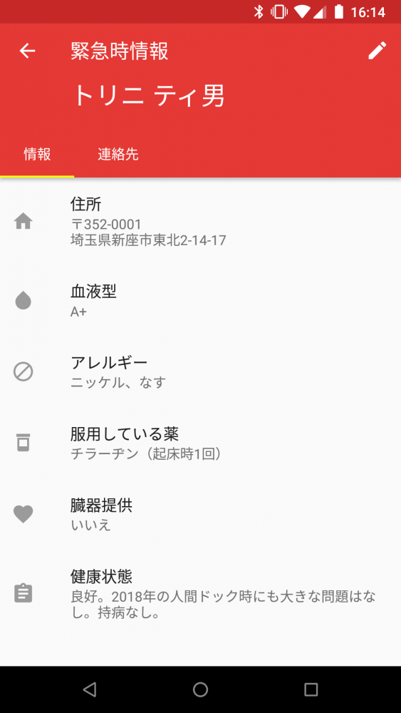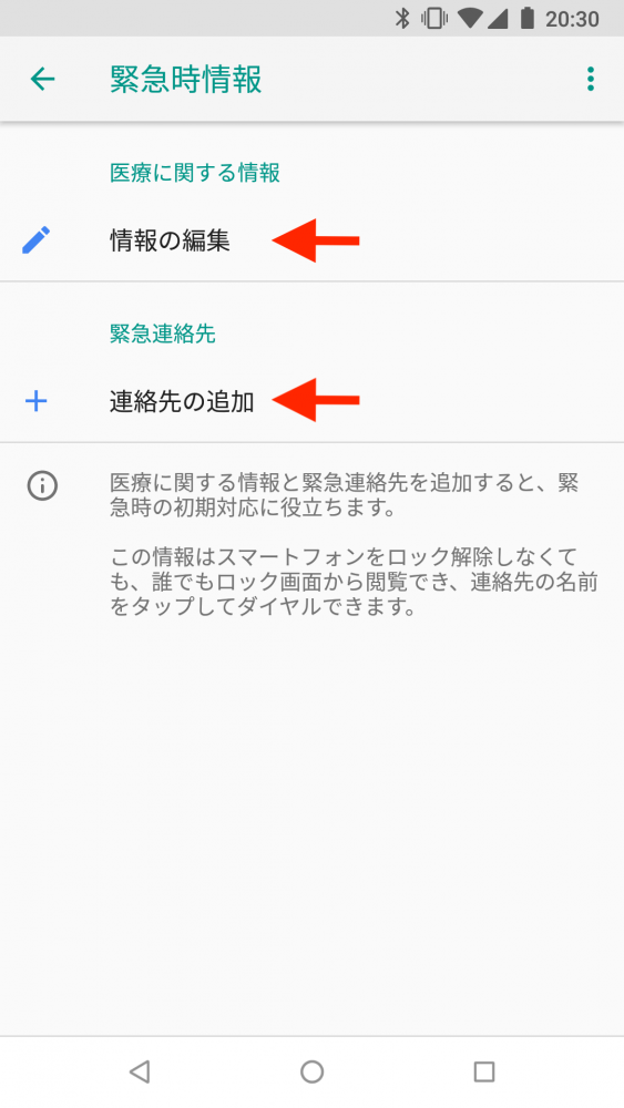 Android 7.0以降で備わっている、万一のための情報を、ロック画面からロックを解除することなく表示させることができる機能です。この緊急時情報には、「名前」「住所」「血液型」「アレルギー」「服用している薬」「臓器提供意思」「健康状態」「緊急連絡先」を登録しておくことができます。