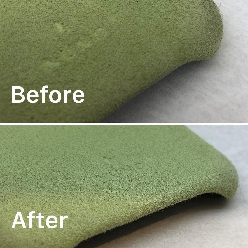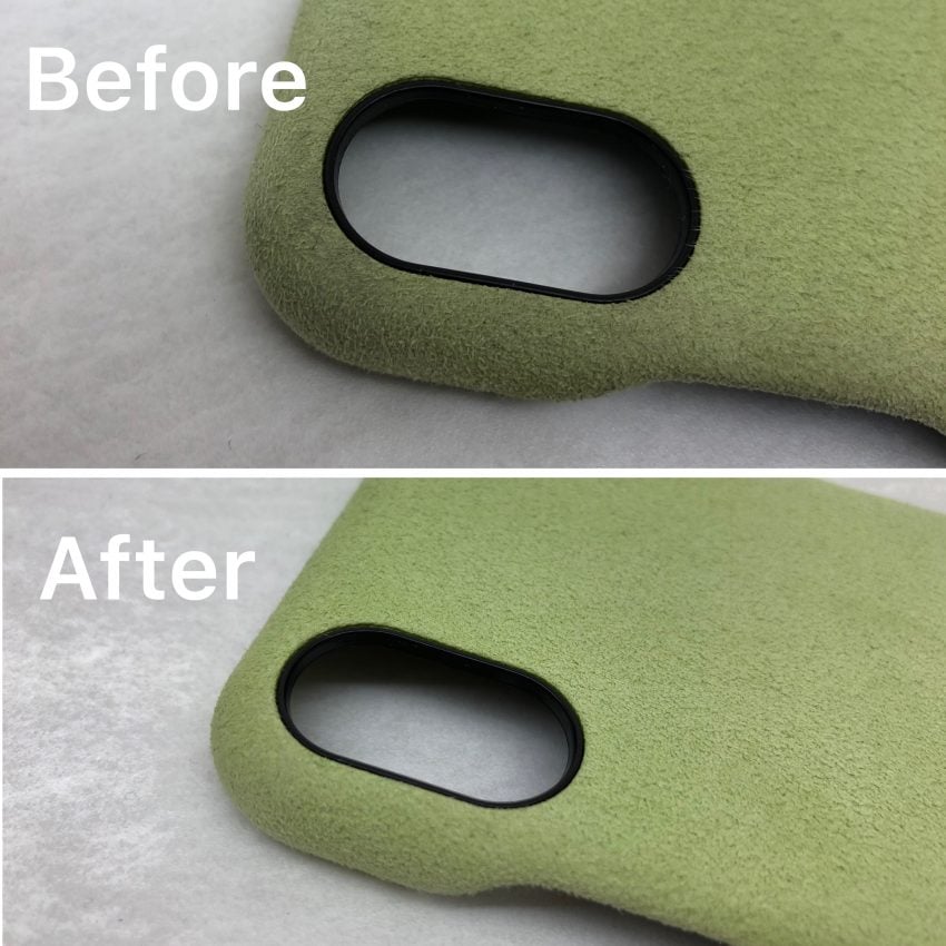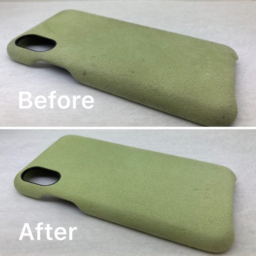写真は、最終手段の③で人工皮革スエード製のスマホカバーをお手入れしたBefore/Afterです。無修正です! 洗剤がよく落ちているかどうかが心配ですが、今のところ抜け毛などもなく大丈夫そうです。