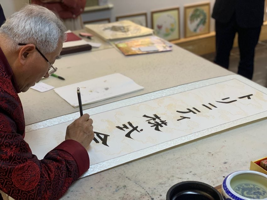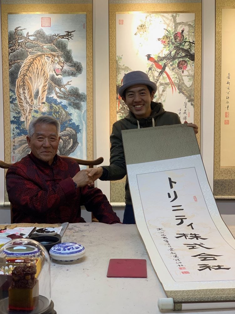 この墨書について、一応ご説明をしておかなければいけません。先日、中国は北京へ社員一同で訪れた際に、天安門広場近くでラストエンペラーでお馴染みの愛新覚羅の末裔であるという書の大家に出会いました。普段は彼が書いたものを販売しているのですが、せっかくならば当社名を書いてもらえないかと依頼してしてみたところ快諾してもらいました。ご本人の意向とは異なり、周りの人がずいぶんな値段をふっかけてきましたが、最終的には普通の値段に落ちつきましたのでお願いして書いてもらいました。