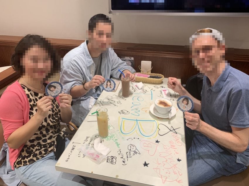 飲み物をオーダーした後、ウェイトレスの方に「コースターをクジのように引いてください」と言われ引いたところ、真っ白なコースターでした。「なんでこれを引かせたんだろうか」とみんな理解ができず、ずっとはてなマークだったのですが、ふと裏返しにしたら、メンバーの名前と顔写真が入ってました!