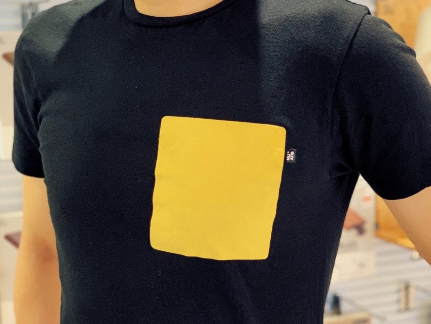 ポケットを、NuAnsブランドで使っているウルトラスエードにしようというものでした。NuAnsのベースカラーである、ブラックとホワイト、それにカーキとサフランをポケットとして胸に貼り付けるというアイディアでした。これにより、展示会では名刺交換が頻繁に行なわれるので、NuAnsの名刺入れである「FLIPHOLER」をポケットに忍ばせるということができるのです。