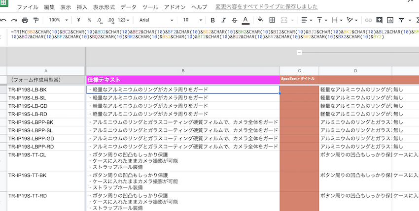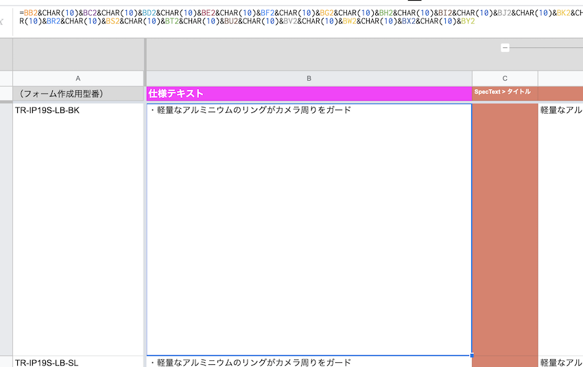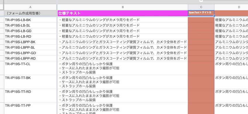 登録する製品数たるや 100 を超えることもあります。また、仕様や特徴によっては「無し」と入力されているものもあるので、それらは無視して、仕様や特徴をひとつずつ拾い出して、セルにまとめて。。。という作業は何時間かかるかわかりません。