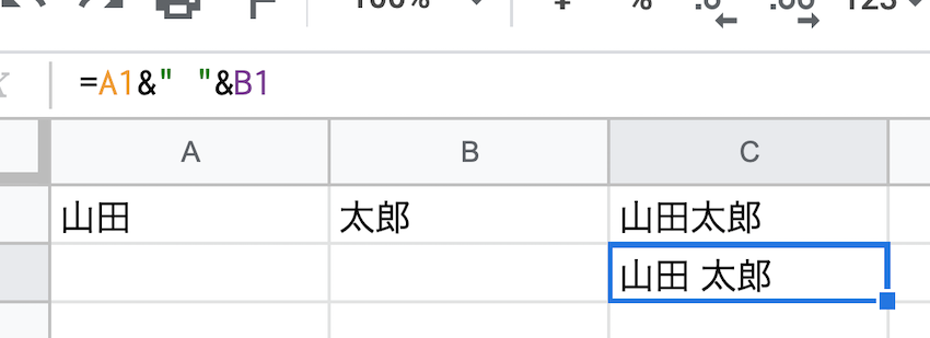 もし、名字と名前の間にスペースを入れたい場合は、「=A1&” “&B1」と入力すれば、「山田 太郎」と表示させることができます。ダブルクオテーション(”)は数式の中に文字列を入れたいときに使います。「=A1&” “&B1」の「” “」の部分は、半角スペースをダブルクオテーションで挟んでいる状態です。