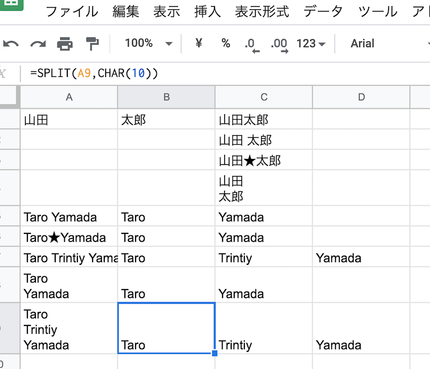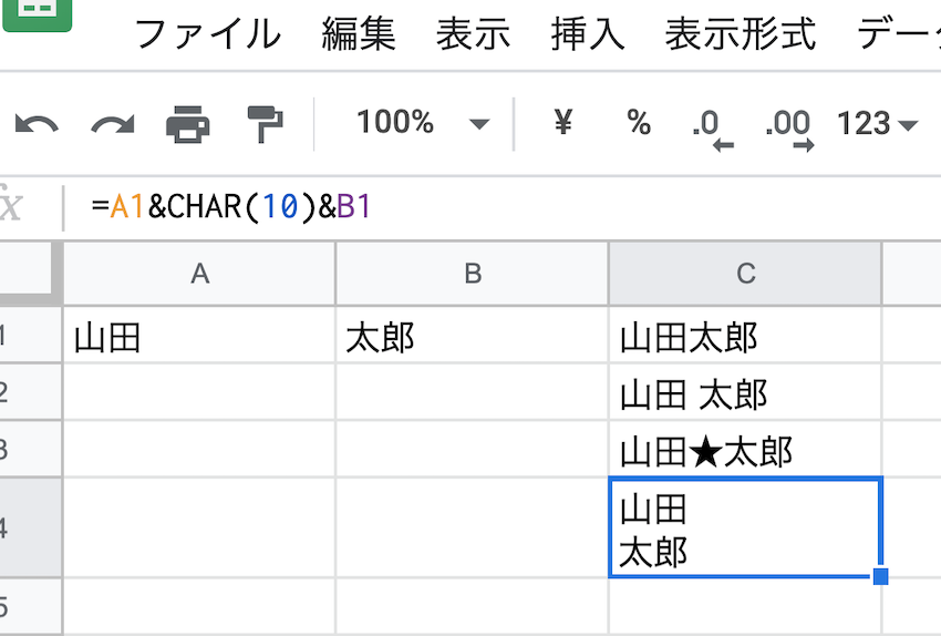 「山田」と「太郎」が改行された状態で表示されました。「CHAR(10)」は文字列ではないので、ダブルクオテーションでは挟まず、そのまま数式に入れます。「CHAR(10)」は一体何者なのか。。。調べてみたのですが、私が理解できる答えは見つけられませんでした汗 「CHAR(10)」は文字列ではない、「CHAR(10)」は改行を意味していることを覚えておくことにしました。