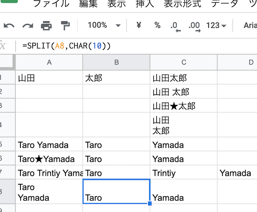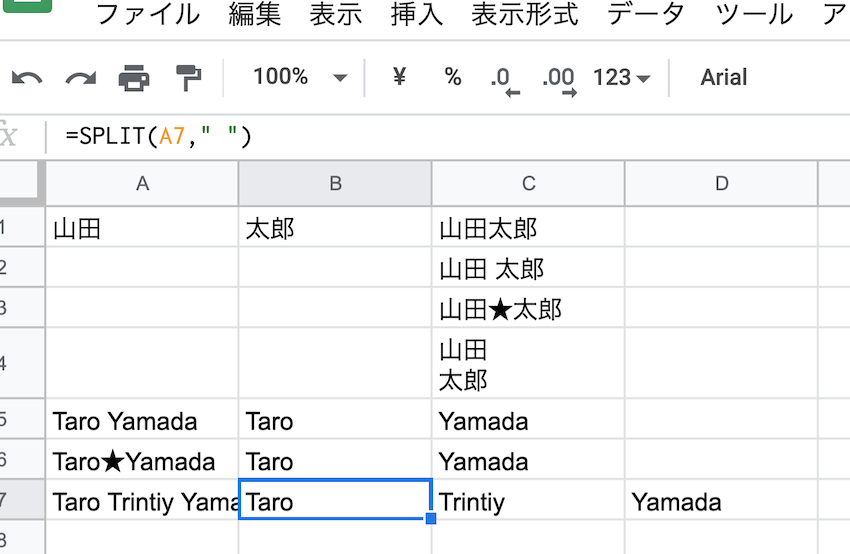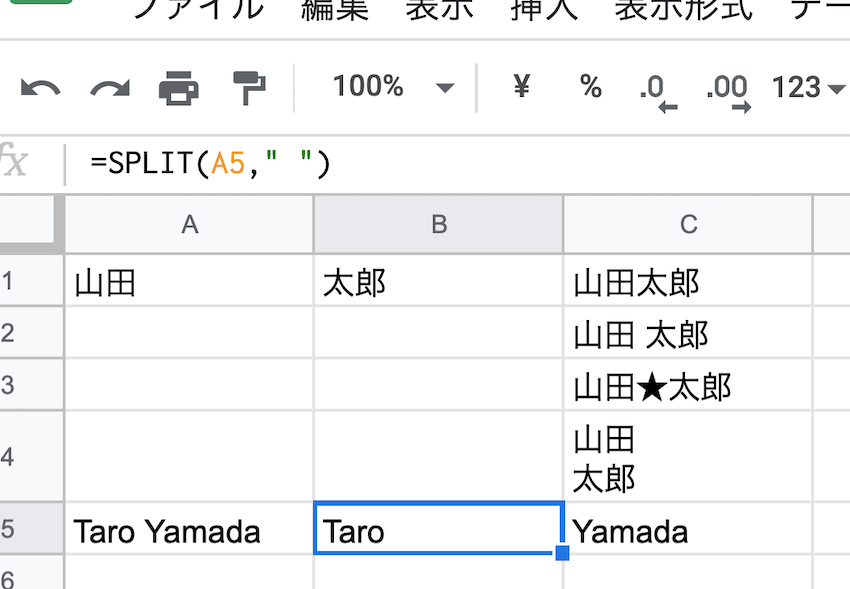 たとえば、「Taro Yamada」というように、名前と名字の間に半角スペースがある場合、この半角スペースの前と後ろを別々のセルに分けることができます。使う関数は SPLIT 関数です。SPLIT 関数には、何で区切るかを入力しますので、先ほど結合させたときと同様に、「” “」を入れます。