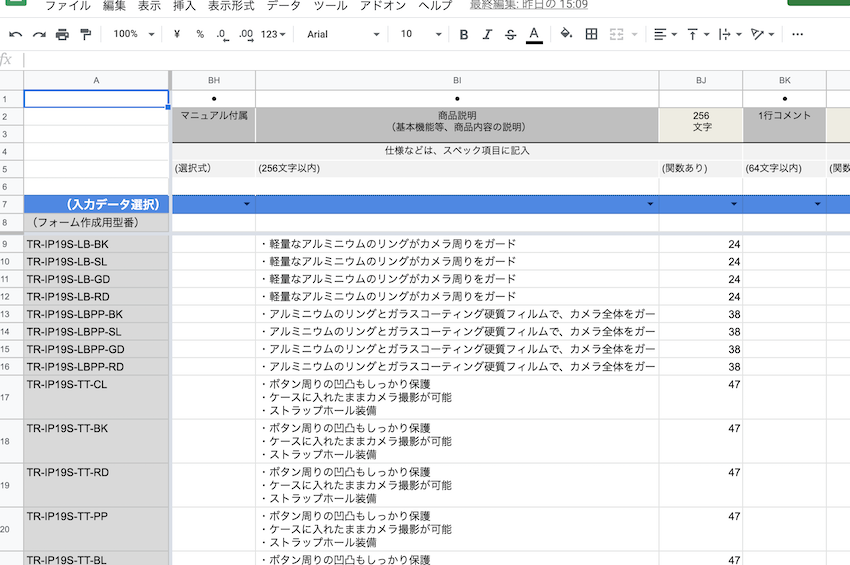 最終的には、この仕様や特徴のキーワードを商品説明文に変換して、取引先や Amazon に登録するための csv やエクセルのファイルに入力していくわけですが、たいていの場合、私たちのリストでは 50 ある項目を、製品登録用ファイルの見出しに合わせて数個ないしひとつにまとめなければなりません。