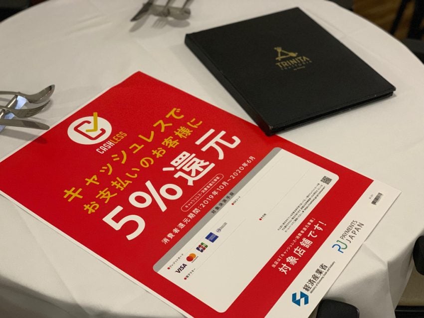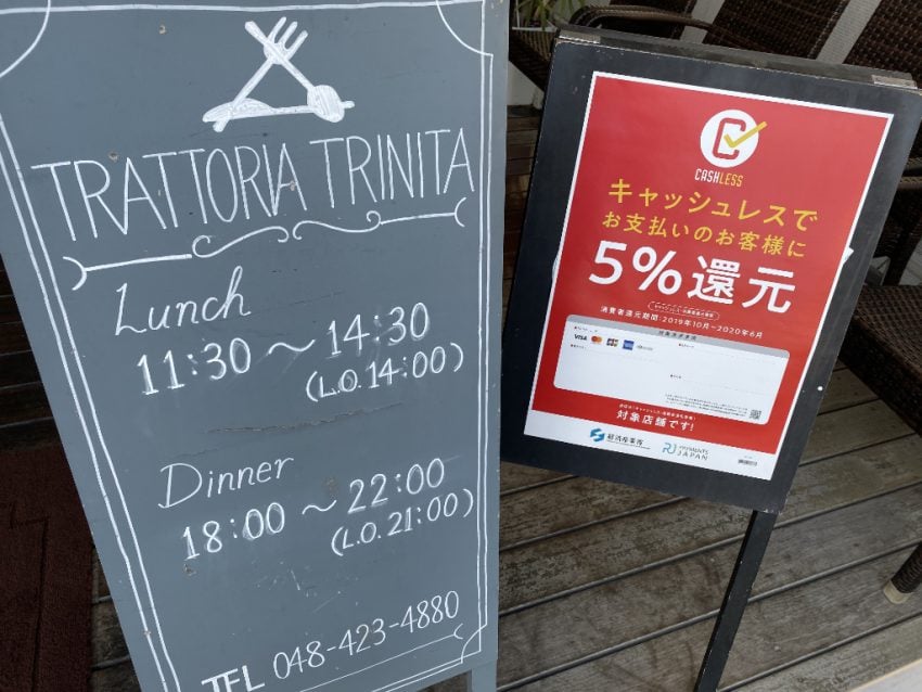 トラットリア・トリニータでは、これ以外にキャッシュレス決済方法としてSuicaやPASMOいわゆる交通系ICカードや、iD、楽天Edy、WAON、nanacoなどのおサイフケータイ対応の決済方法に加えて、QRコード決済のPayPayに対応しています。しかし、これらの決済方法は現時点においてはキャッシュレス・ポイント還元事業として認められていません。