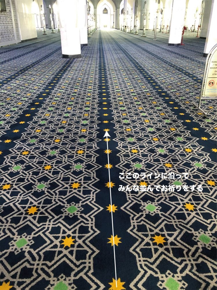 ガイドさん曰く、昔は空調機も一切なく暑かったみたいなんですが、今は快適にお祈りができる環境に整っているみたいです。お祈りする方向はどの場所のモスクでも決まっているとのことで、聖地であるメッカの方角に向けてお祈りを捧げるみたいです。