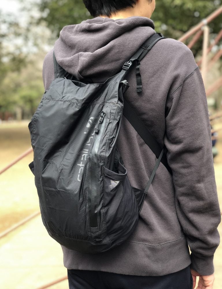 そして20Lという大容量には見えないすっきりとしたデザイン。特にリュックの上部が肩紐に沿うように作られているため、背負っている時の形が非常に綺麗です。しかも、中身が少なければロールアップの開口部も隠してくれるので、とてもすっきり見えます!