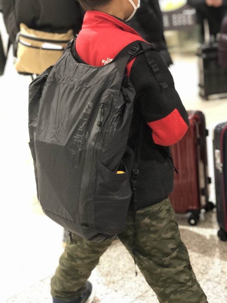 チェストベルトとロールアップ開口部をキャリーケースの柄の部分にまわして留めると、すっぽりといい感じに収まってくれました。これは正式な使い方ではないのですが、旅行の際には意外と便利な機能だと思います。