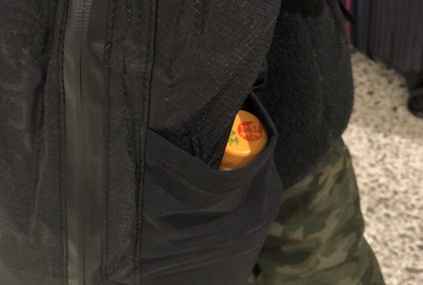 両サイドについたメッシュのドリンクホルダーが便利です。ロールアップの開口部はやはり開け閉めに時間がかかるのが難点。でもこのサイドポケットと大きなジッパーポケットのおかげでストレスフリーです。