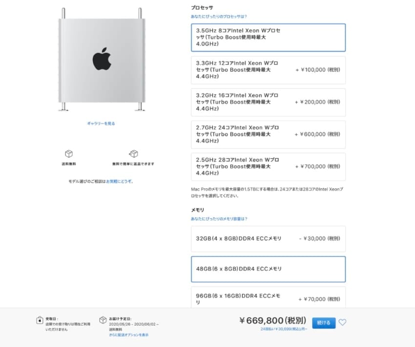 とはいえ、最高といいつつもMac Proのカスタマイズでフル機能にしてしまうと高価すぎるので、メモリーを48GB、内部ストレージを1TBにしたモデルにしました。