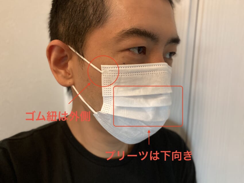 最後に。自分でも量産品を初めて装着してみました。これまでのものよりも装着感と、耳の痛さが無いように感じます(個人差があると思います)。そして、パッケージにも記載していることではありますが、表裏がありますので装着の際には十分ご注意ください。痛くないように、耳紐部分が外側に来るようになっており、ゴミが溜まらないようにプリーツは下向きになっています。