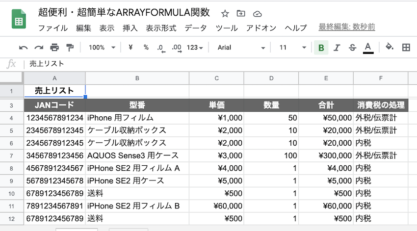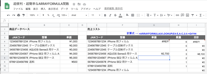 ARRAYFORMULA関数とは。私なりに説明すると、「計算式をひとつのセルに入れるだけで、指定した範囲すべてに計算式の結果を表示してくれる関数」です。