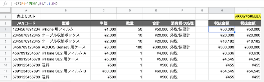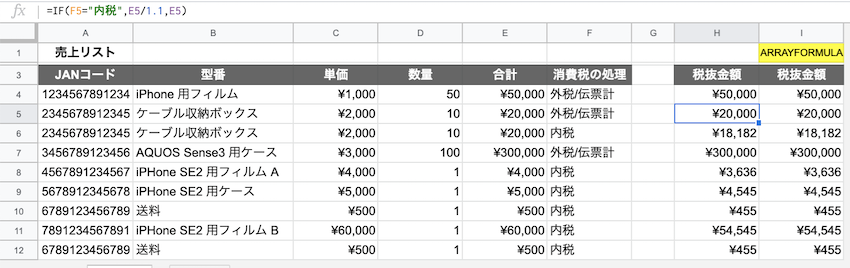 • 【Step 2】=ARRAYFORMULA(IF(F4:F=”内税”,E4/1.1,E4))