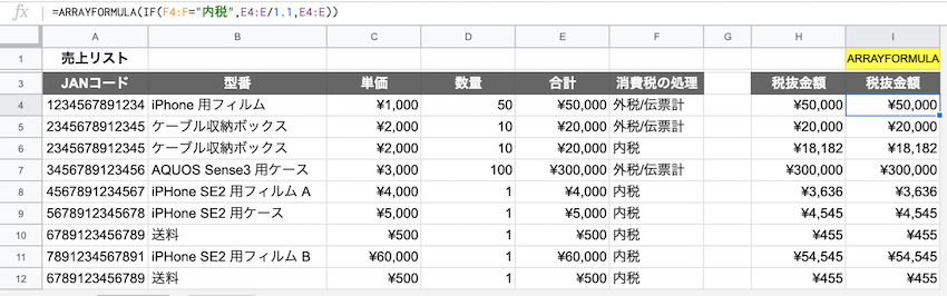 • 【Step 3】=ARRAYFORMULA(IF(F4:F=”内税”,E4:E/1.1,E4:E))
