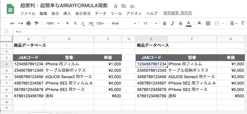 • ARRAYFORMULA関数を使わない計算式:=A4