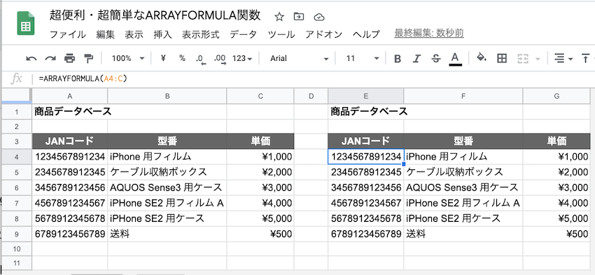 • ARRAYFORMULA関数を使った場合の計算式:=ARRAYFORMULA(A4:C)