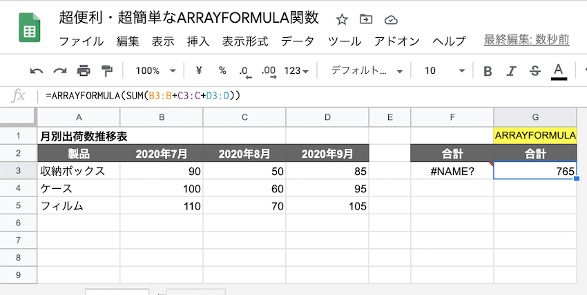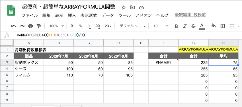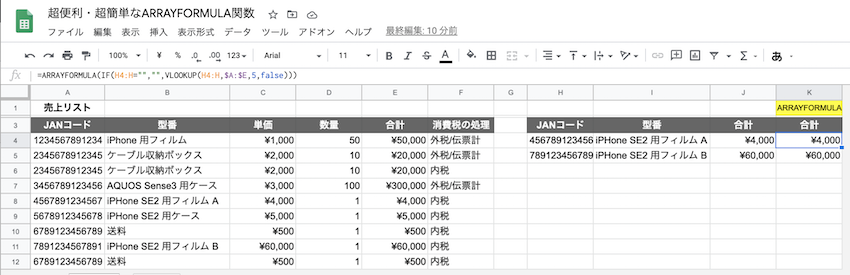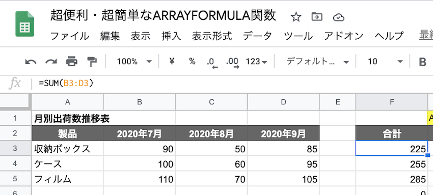 今回は、私がよく使っているARRAYFORMULA関数をご紹介したいと思います。