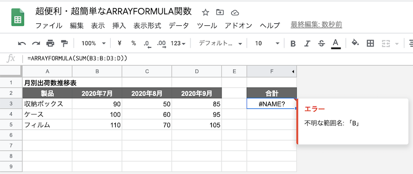 では、先ほどの「セル」を「セルの範囲」に書き換えるルールを使ってこの計算式でARRAYFORMULA関数をくっつけてみると、