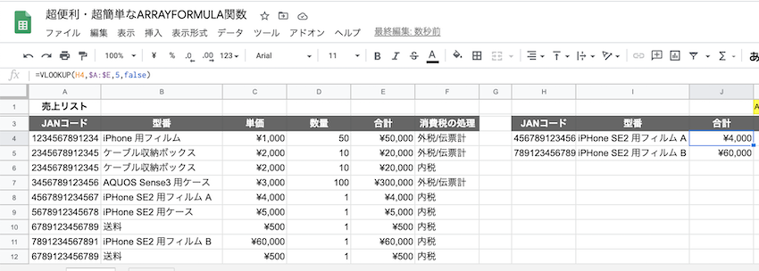 • IFERROR関数を使った場合:=ARRAYFORMULA(IFERROR(VLOOKUP(H4:H,$A:$E,5,false)))