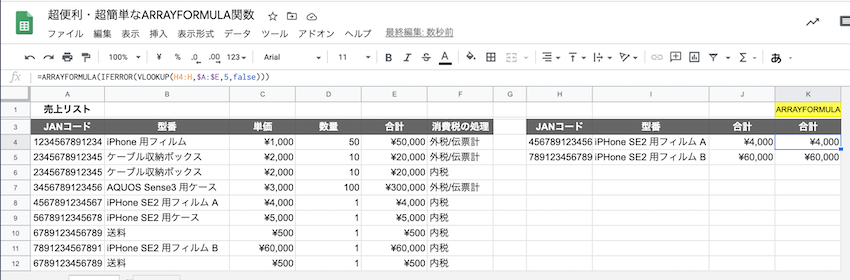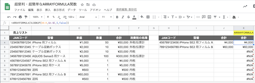 • ARRAYFORMULA関数ありの場合の計算式:=ARRAYFOMRULA(SUMIF(E:E,A4:A,I:I))
