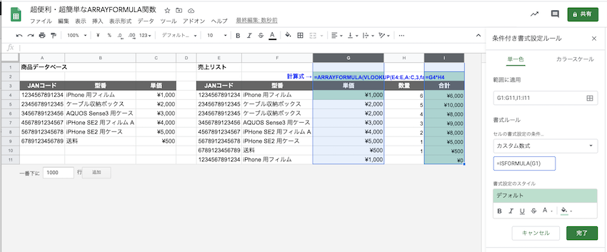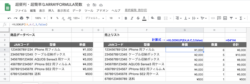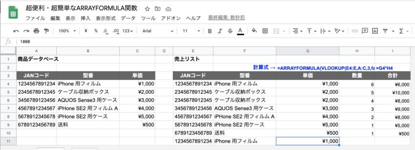という計算式をセル:G5からG10までコピペすると、G列すべてに単価が自動入力されるようになります。この計算式にARRAYFORMULA関数をくっつけると、