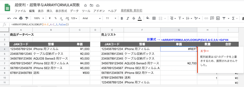 • (メリットでもありデメリットでもある)ARRAYFORMULA関数で指定している範囲にデータを入力するとエラーが発生するため、表の使い方に応じて、ARRAYFORMULA関数を使うかどうかを判断する