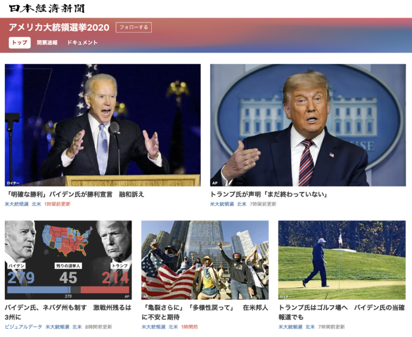 現職のトランプ大統領の方は「バイデン氏は勝者を装うことを急いでいる。選挙はまだ終わっていない」と述べて、法廷闘争も含めて戦い続けるということを宣言しているようです。