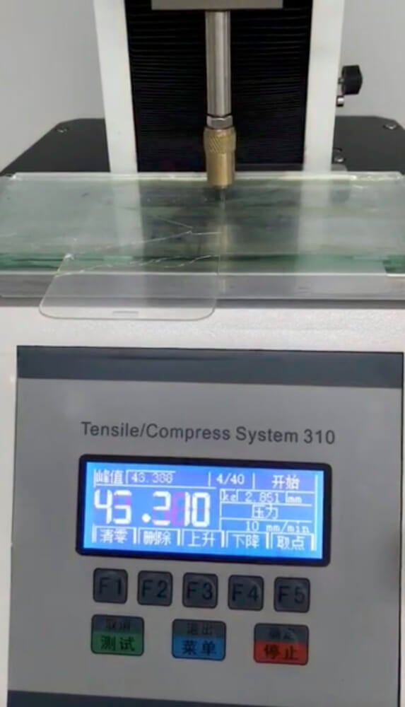 ガラス側面を上の写真の機械で全力で磨いていきます。その後、強化処理もすべて終わらせエッジテストを行ないます。エッジテストは、ガラスエッジに上から加重をかけて割れた時の最大値を計測します。
