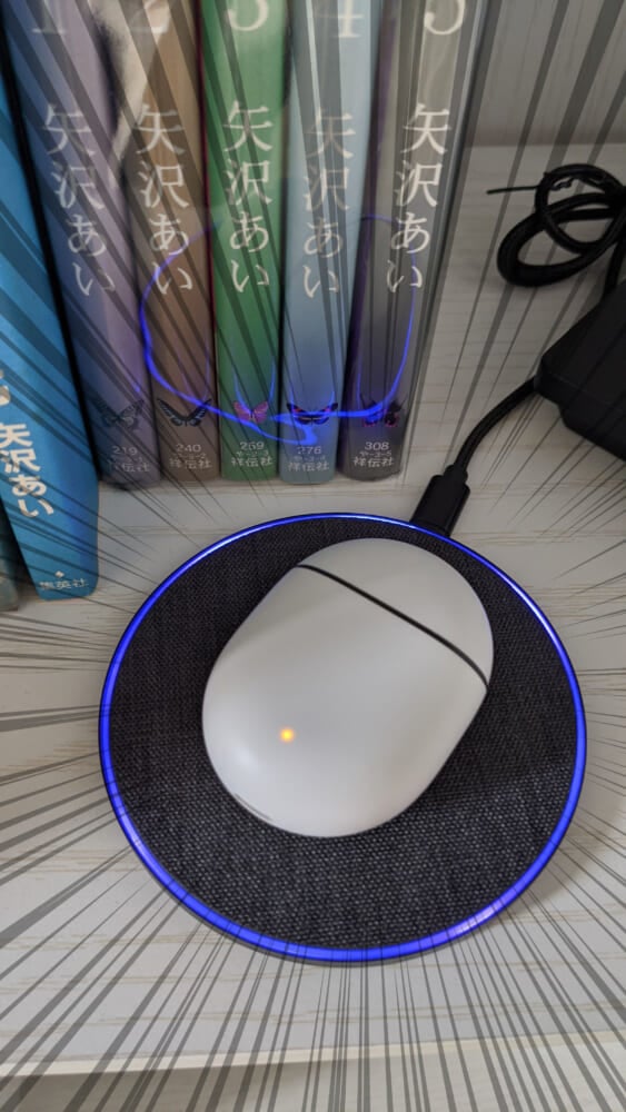 そういった経緯もあり部屋の隅っこで眠らせていた「Owen」なのですが、ボディをヤられた瞬間、「ワイヤレス充電ってスマホ以外も使えるよな…」と突然閃いたので、いつも充電を忘れがちなワイヤレスイヤフォンを「Owen」に乗せてみました。