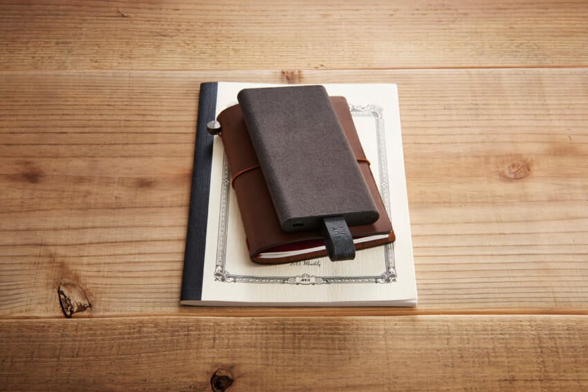 端末と重ねて手持ちしてしっくりくるサイズ感。薄さも約14mmで、iPhoneのフル充電は約2回可能。ウルトラスエード生地、テナージュ素材など触感にも訴える作りは、デジタルなのだけども人間味を大事にするトリニティらしさが出ているという点でもぜひご活用いただきたいと思いますね。