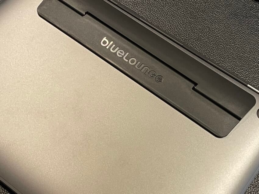 泣く子も黙るか分かりませんが、ラップトップPCの定番アイテムとして長年愛されているBluelounge KickFlipはMacBook Pro(13-inch, M1, 2020)とも相性抜群です。通常は折りたたんでおき、ほんのりだけ傾斜がつき、フリップをカチッと軽快に立てればしっかりと角度を付けてタイピング効率向上や、画面を少し上げてみやすくする効果があります。