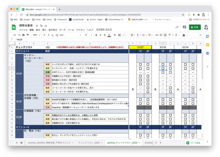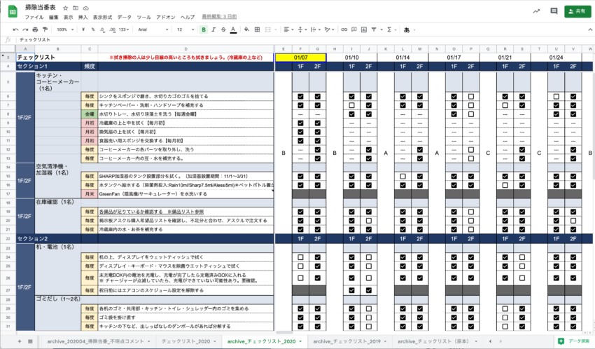 トリニティでは、毎週火曜日と金曜日の朝に掃除をしています。Googleスプレッドシートで掃除当番表を作り、自分が担当する場所の掃除が終わったら、チェックボックスに✓を入れることになっています。