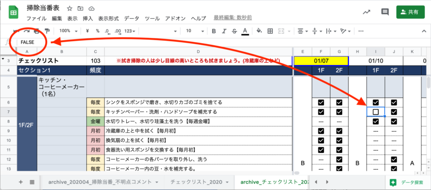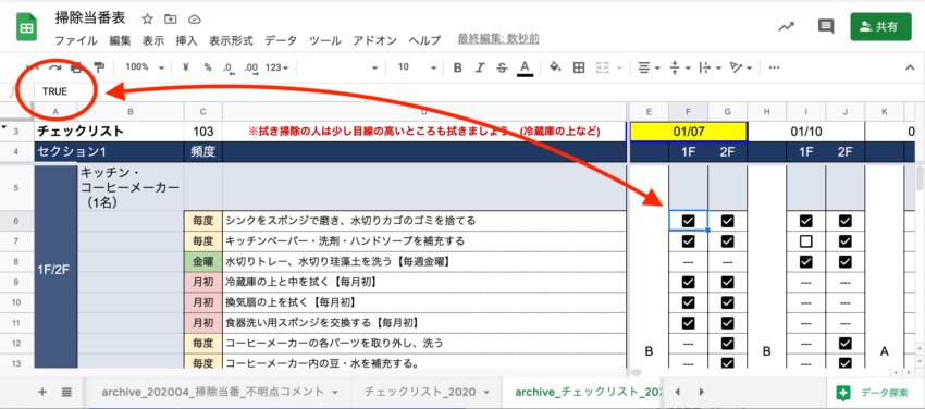 これが何を意味しているのかというと、チェックボックスに✓が入っていないセルは「FALSE」、✓が入っているセルは「TRUE」として計算式の条件などにも使えるし、置換もできるというわけです。