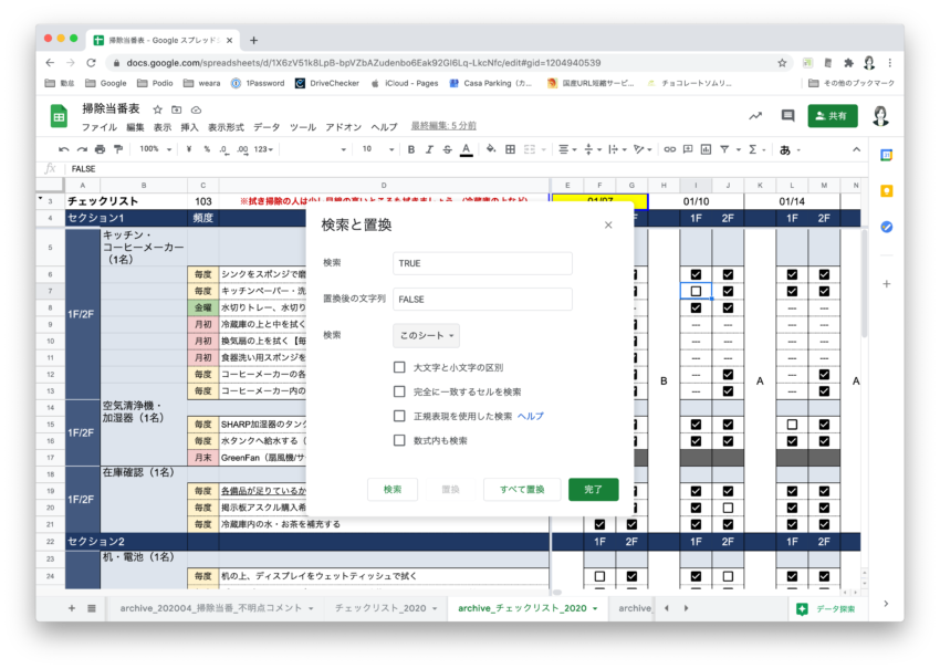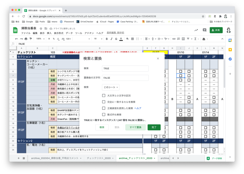 「すべて置換」をクリックすると、「TRUE に一致するインスタンス 1,347 個を FALSE に置換し…」というメッセージが表示されて、このシート内のチェックボックスの✓がすべて外れました。