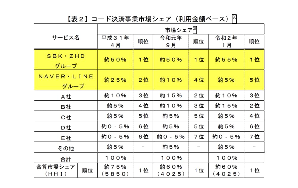 PayPayはキャッシュレス決済の中でもコード決済型、いわゆるQRコード決済のシステムとしては圧倒的なシェアを誇っています。ちょうど先日PayPayサービスを手掛ける親会社のZホールディングスとLINEの経営統合により、LINE Payとも統合されるということがあり、公正取引委員会が総合的に合併について審査をした結果が公開されています。