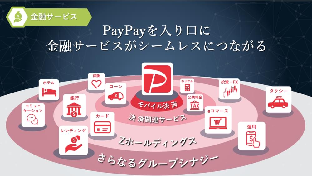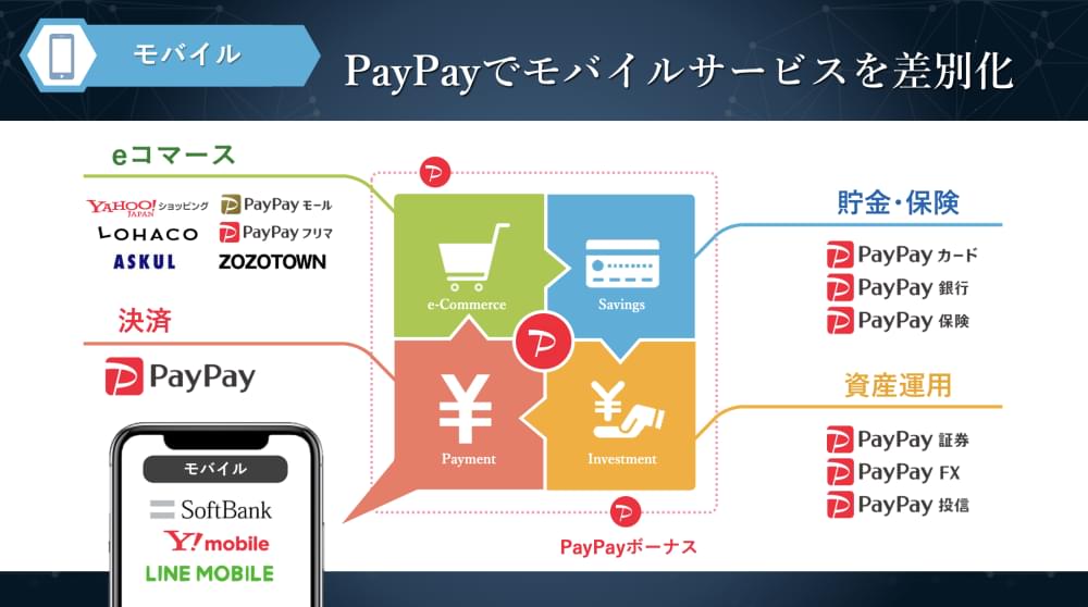 前述の「ソフトバンク株式会社 2021年3月期 第1四半期 決算説明会」の資料においても、PayPayプラットフォーム戦略が示されています。金融サービス、モバイル、eコマースの分野において、PayPayというプラットフォームを活かして、シナジー効果によりすべてのビジネスの収益を上げていくことが戦略です。