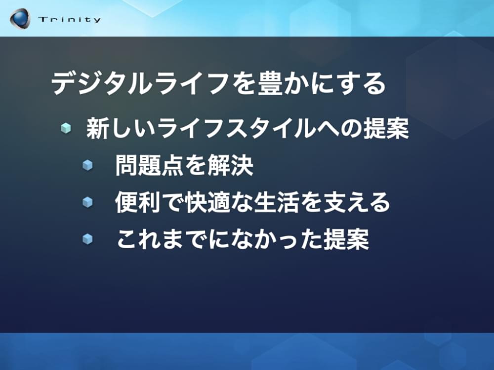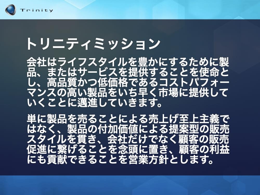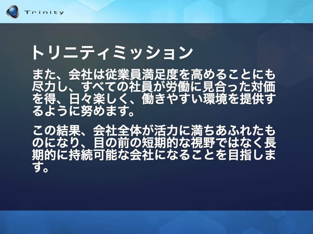 トリニティビジョンを発表といっても、社内向けですので全文公開するということではありません。ただ、いくつかは社外秘でもないので一部だけご紹介してみようと思います。