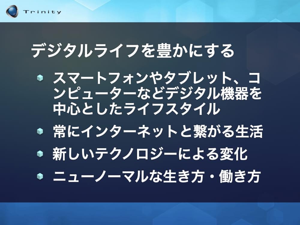 新しいデジタルライフは、まだ人々が体験したことがないようなことがあり、そこに問題が発生することがありますので、それを解決していきたいと考えています。また、デジタルライフとは基本的に何か便利になったり、時間がかかっていたことが素早くできたりと、便利で快適な生活になるものと考えています。それを支えるような製品・サービスを提供していきたいと考えています。
