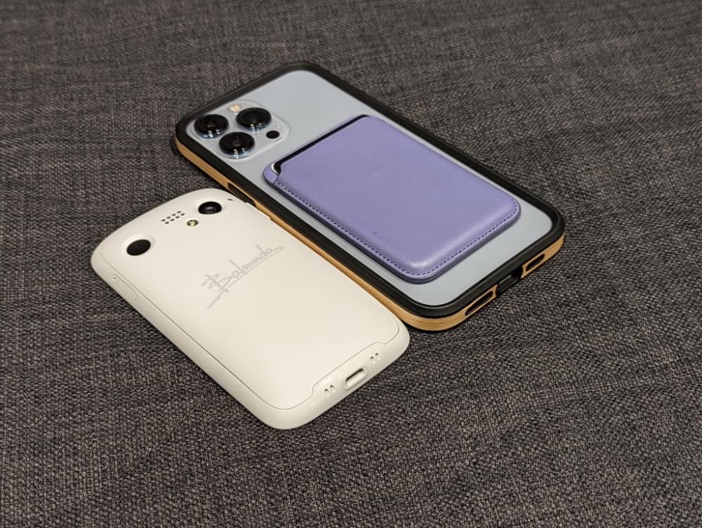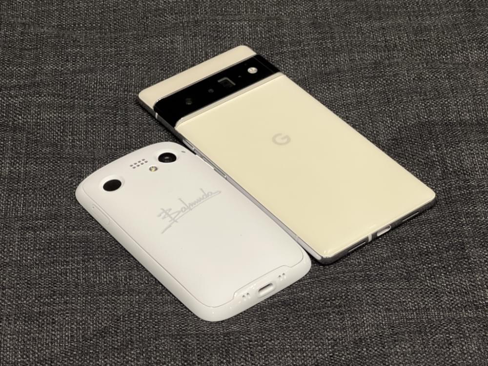 私はずっとiPhoneで言えばPlusやMaxといった大画面タイプを使ってきて、現在はiPhone 13 Pro Maxがメインとなっていて、サブでPixel 6 Proを使っています。両方とも、現在のスマートフォンの中でもかなり大きい部類に入ります。並べてみると一目瞭然。BALMUDA Phoneは長いこと使ってきたスマートフォンの感覚とは全然違います。