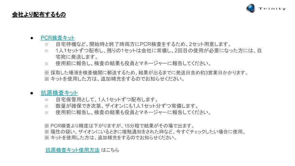 しかし、最近は非常に混んでいるようで、検査を受けるまでに時間がかかったり、検査結果もすぐに出ない場合があるようです。何かが疑われるときに、できる限り早く検査ができた方が良いということでPCR検査キットと抗原検査キットを配布することにしました。これにより、抗原検査キットで即時確認し、PCR検査キットで採取当日も含めた3日間で結果が出ることになります。なお、ザイオン側にもそれぞれ社員全員分を別途備蓄しています。