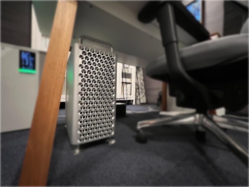 さて、問題は置き場です。Mac Proはデスクの足元に置いています。これは高さもあるのでデスクの上に置くことができないという理由からですが、同じ位置にMac Studioを置くとなると、逆に小さいのがポツンとなってしまいます。やはり、デスクの上に置くのが自然だと考えました。