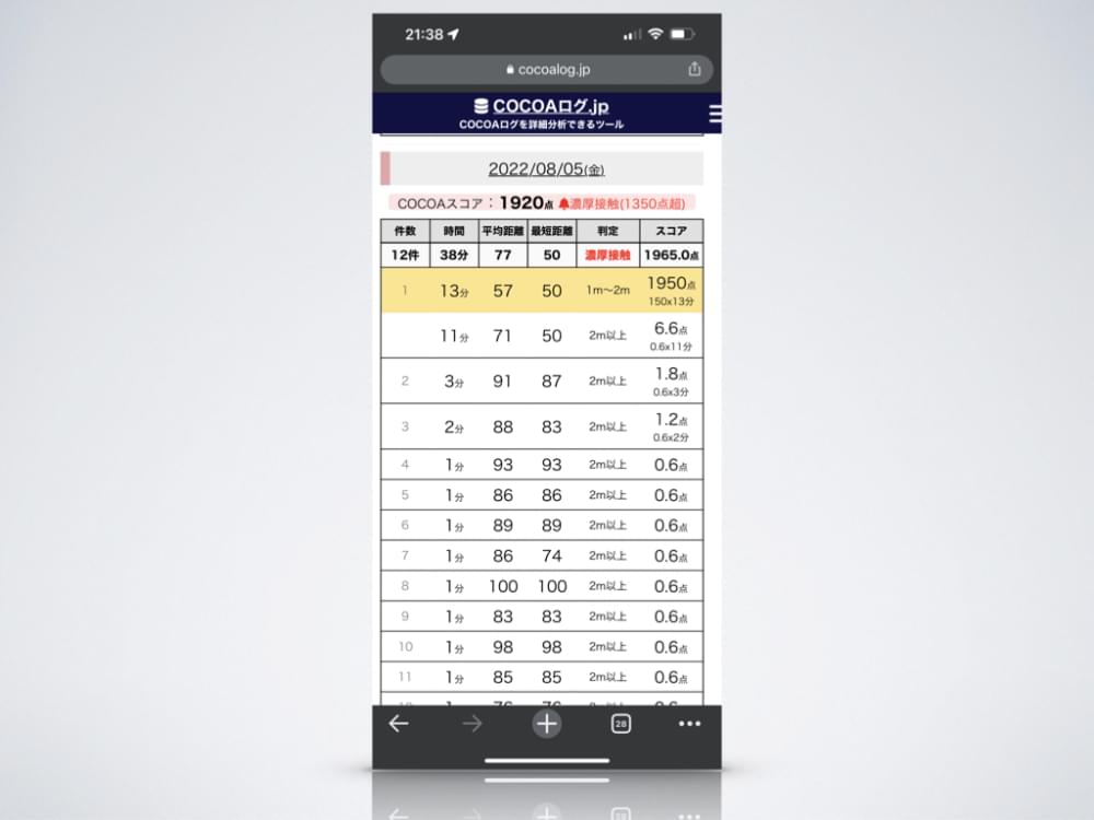 ここから見て、COCOAアプリの通知だけで何かを判断するのは無意味だと思いました。その上で、このCOCOAログ.jpもCOCOAアプリのみよりは詳細が見られるものの、肝心の時間がわからないので、この13分がいつどのような状況だったのかを特定することができません。たとえば移動中の時間だったとしたら、電車でマスクをして、会話することもなく移動していただけならば、たとえ隣に陽性者がいたとしても特に心配する必要はないと思います。