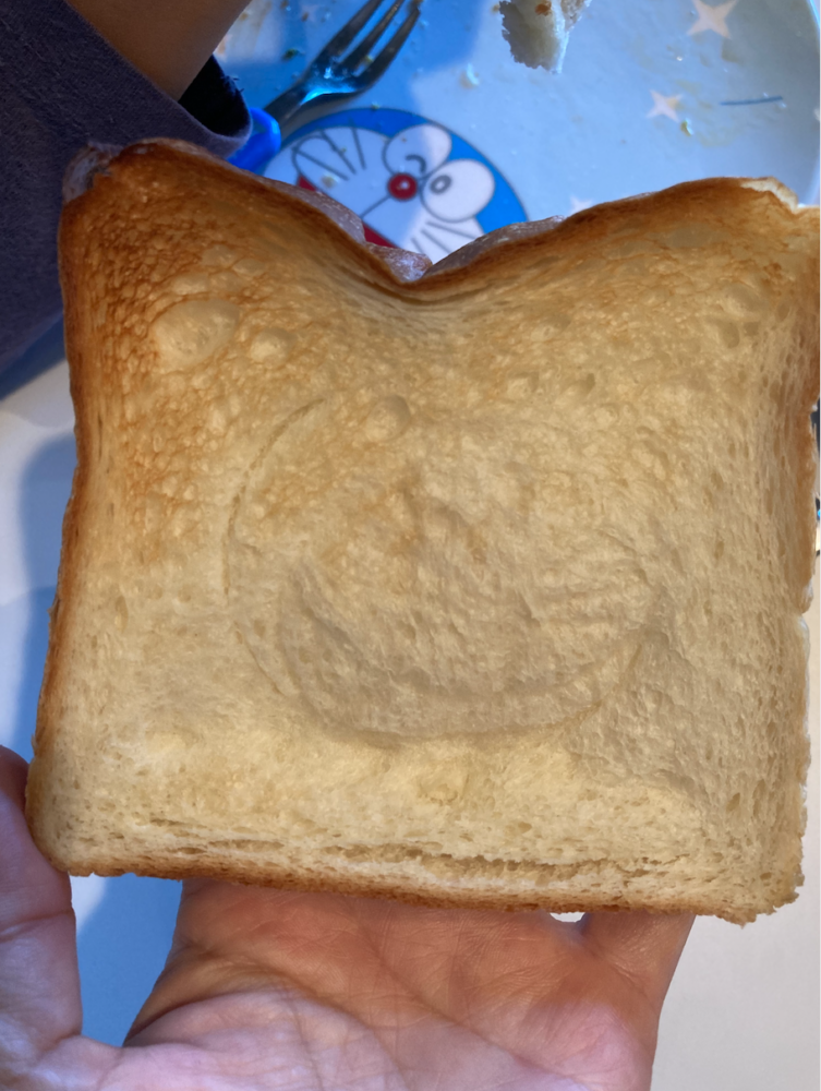 たーにゃも負けじとパンを焼きました。と言っても同じく粉からではなくトースターで焼いただけです。二児の母として可愛いスヌーピーに負けてられないので、雑誌小学一年生の付録でもらえたドラえもんのアンキパンセットで映えるパンを焼いてやろうと思ったのですが、