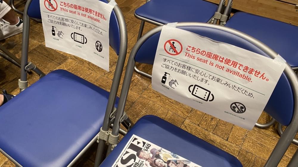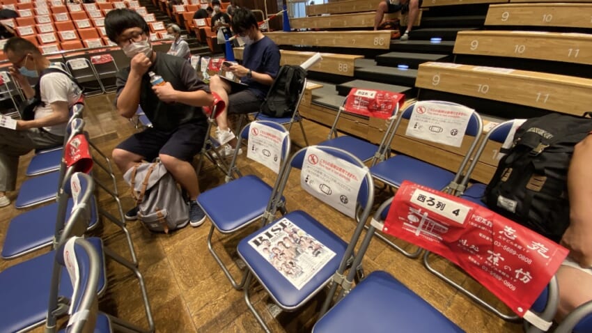 後楽園ホールは建物の5階にあるのですが、エレベーターは密になるということで階段で昇降し、物販も無し、声援も禁止、などとかなり厳しい状況でのイベントでした。実際、席も写真のように2つくらい離して設置されていますので、今回2名で連れ立っていったのに、席は2つ分空いた隣になるという何とも言えない感じになってしました。でも、それでも苦労して開催してくれて、選手が活躍する場を作ってくれていますので良いのです。
