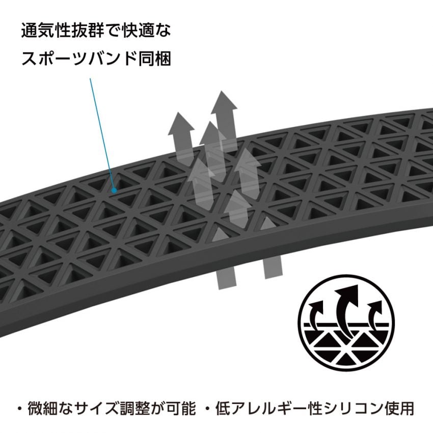 そしてもう一つのポイントとして、こちらのケースにはブラックのスポーツバンドが同梱されております。穴の開いたトラス構造のため、細かなサイズ調整が可能となり、抜群のフィット感が着用者の腕周りを包み込みます。通気性もよく、皮膚呼吸のしやすいバンドとなりますので、通年通して爽やかな気持ちでお使いいただけると思います。