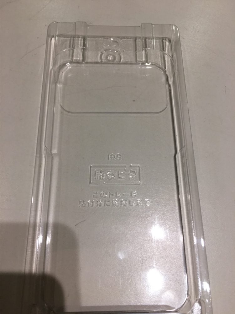 端末ぴったりサイズのプラスチックトレーです。レンズ側を下に向けて端末を入れると、しっかりと固定されます。貼り付け時の安定感を格段に向上させ、位置ずれを防止する、縁の下の力持ちです。